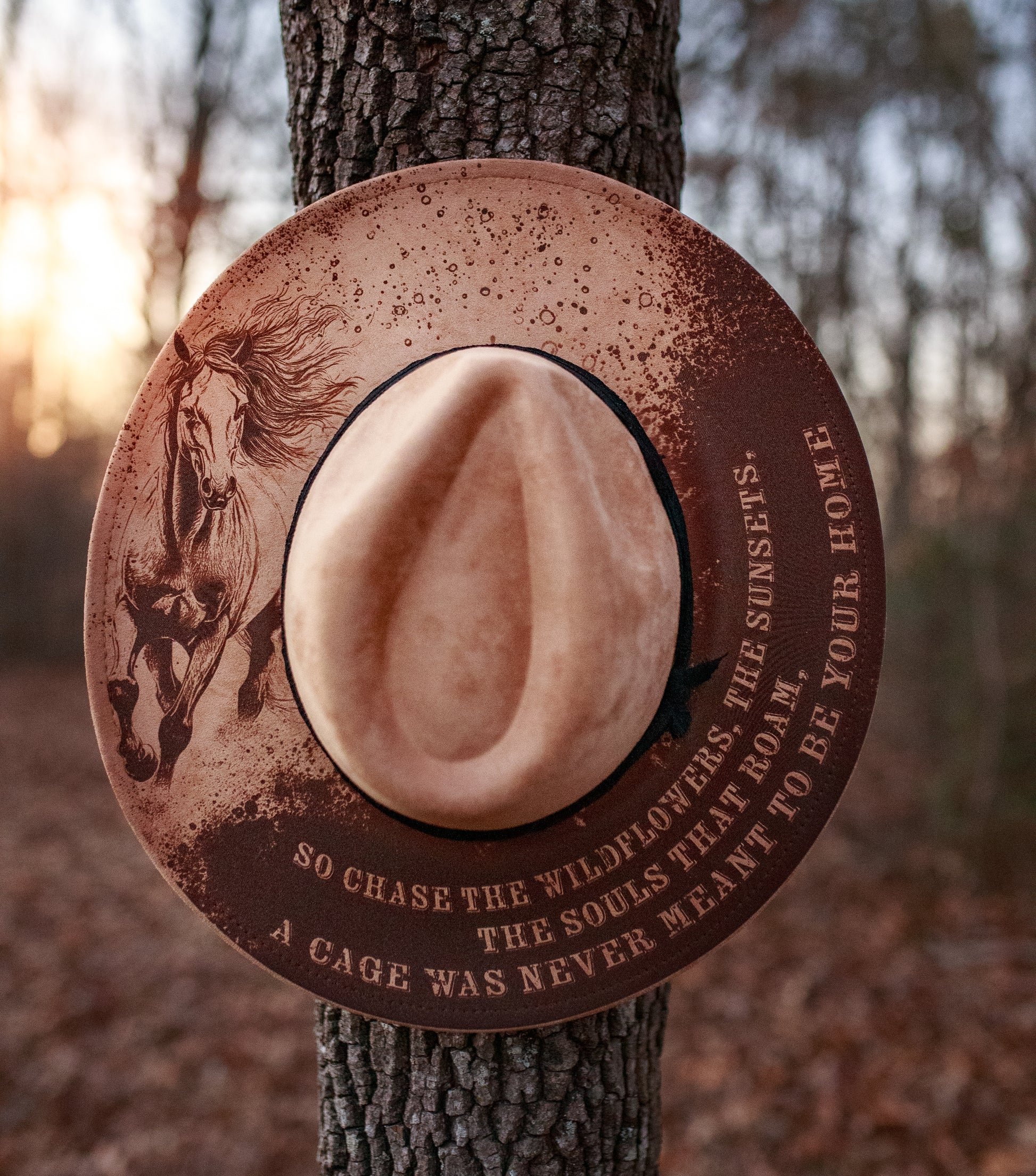 A beautiful horse design with the words "So chase the wildflowers, the sunsets, the souls that roam, a cage was never meant to be your home."