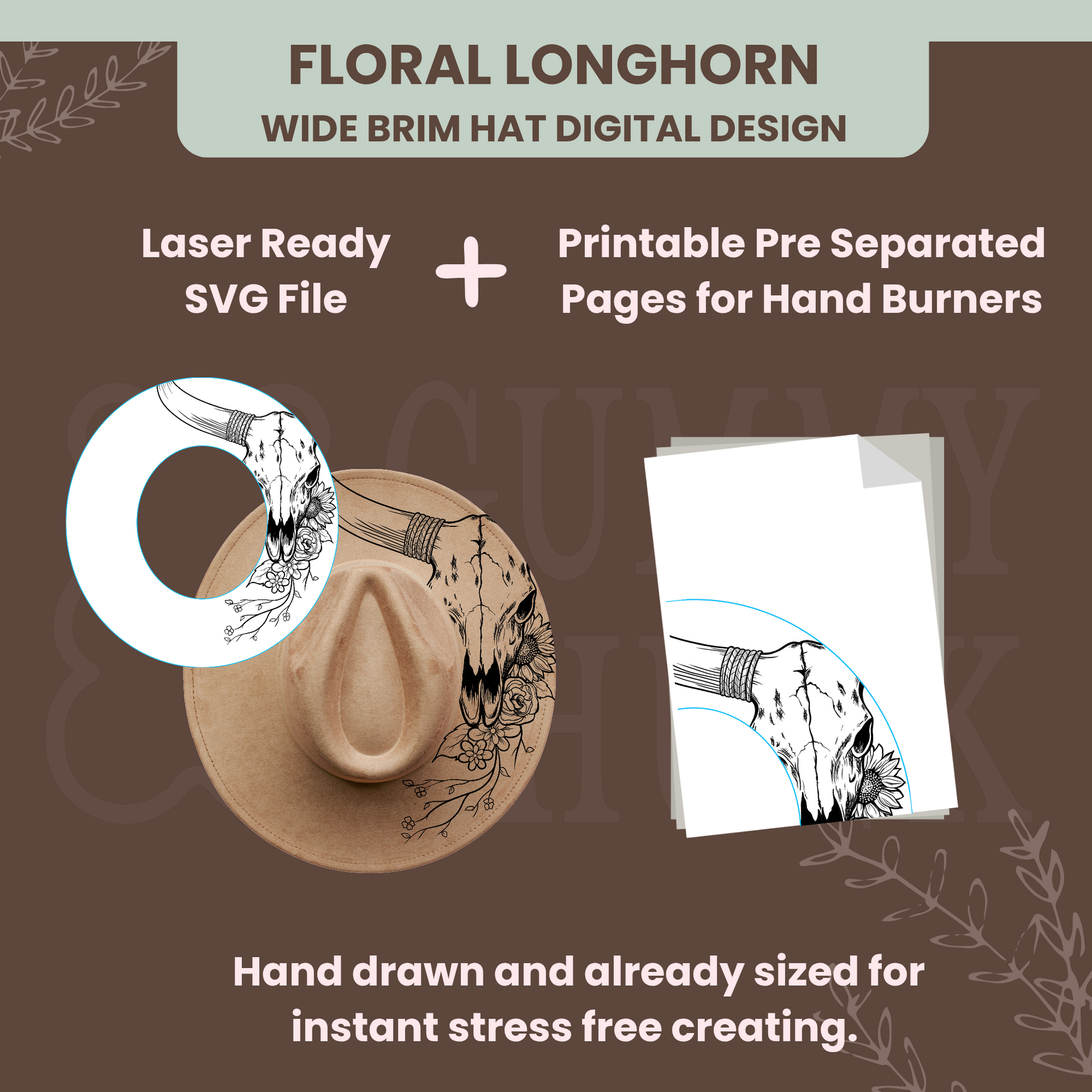 Floral Longhorn Hat Wide Brim Template for Burning - SVG and PNG Files