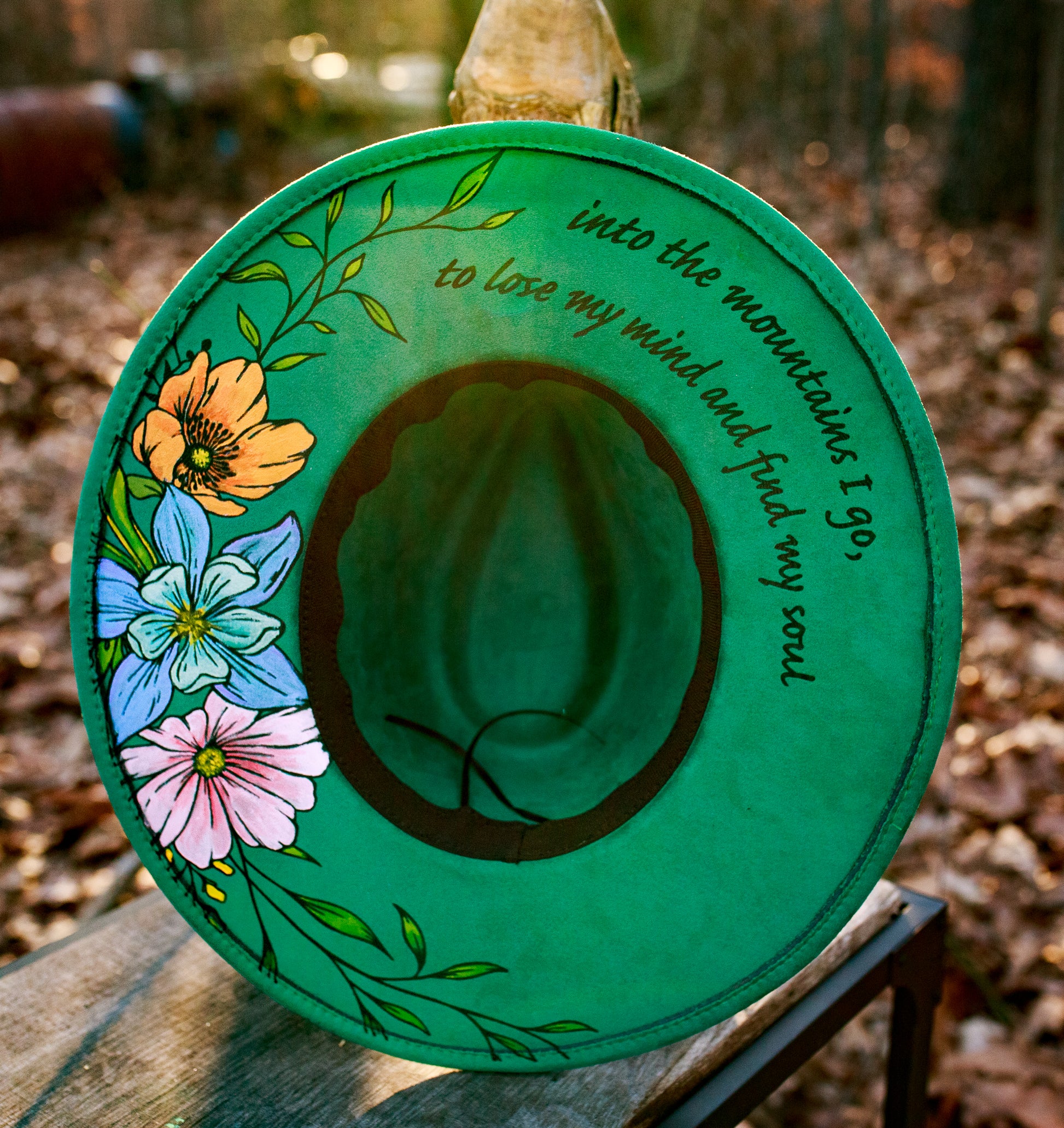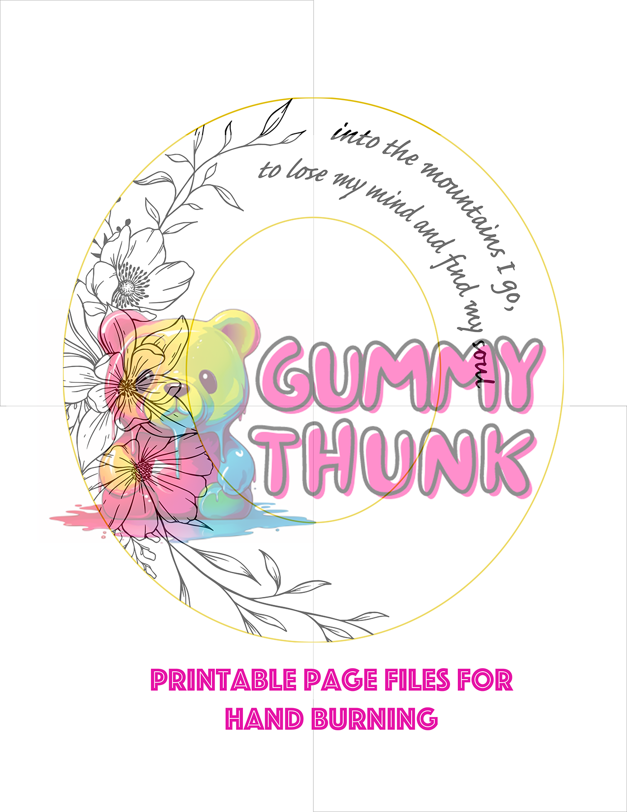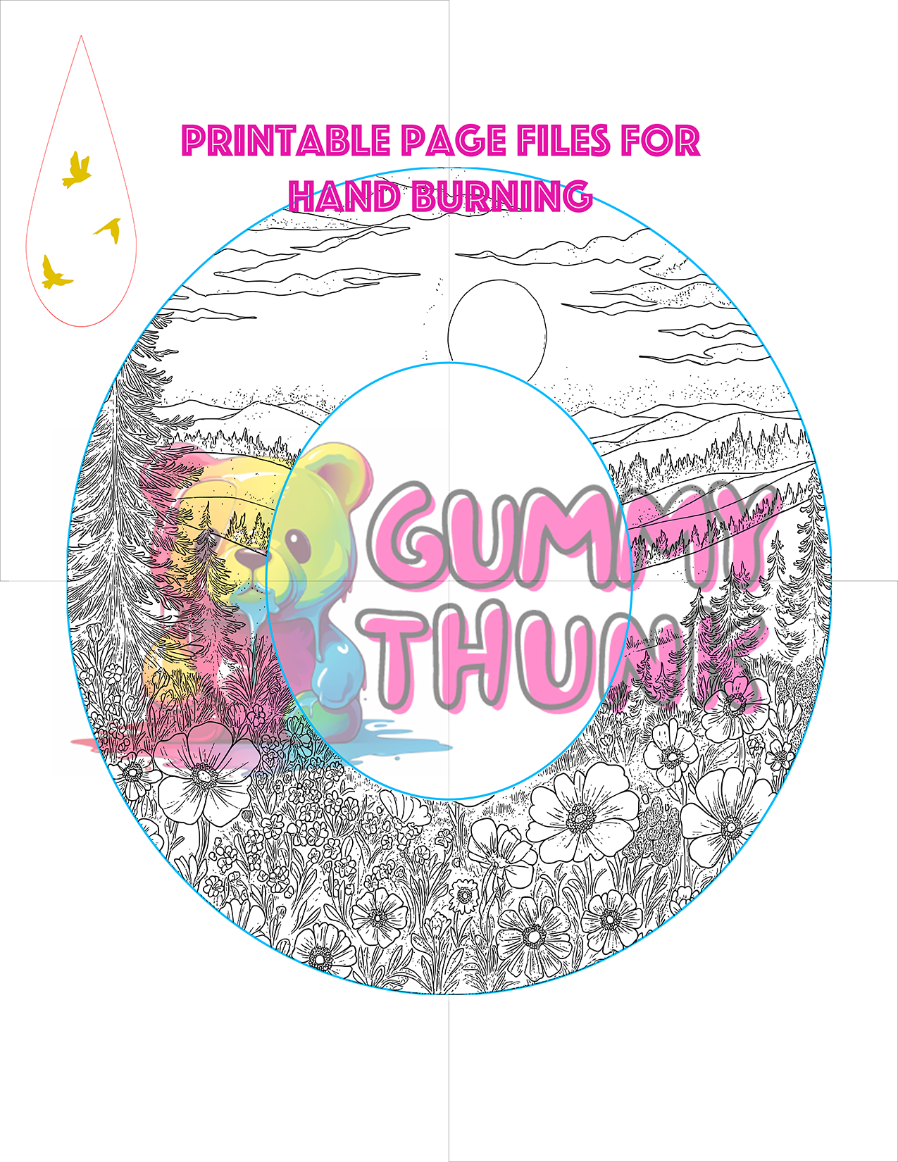This is an SVG and PNG file for my Into The Mountains hat design. It includes a template for both the top of the brim and the underside of the brim. It also includes a pre separated printable design for hand burners.
