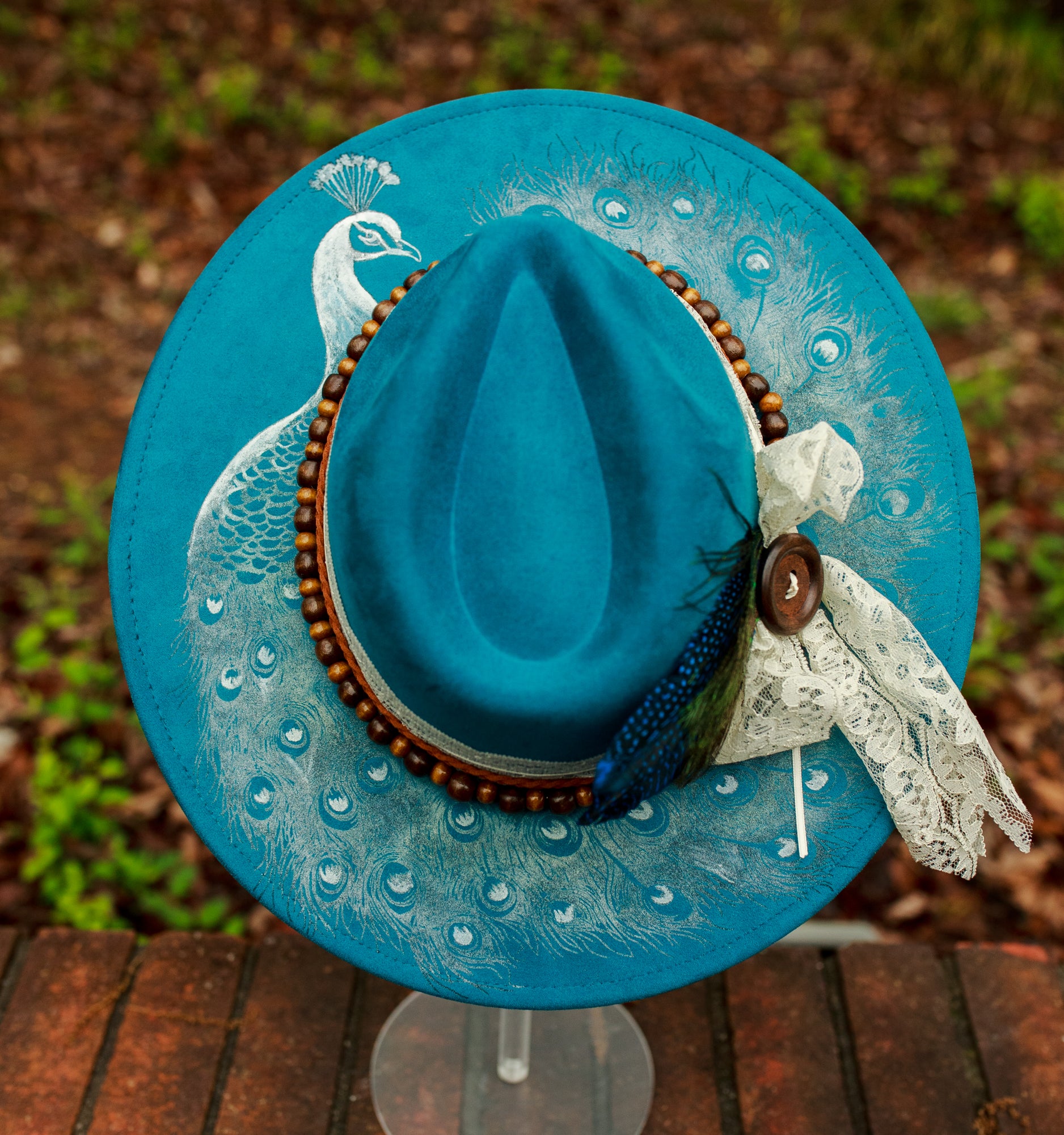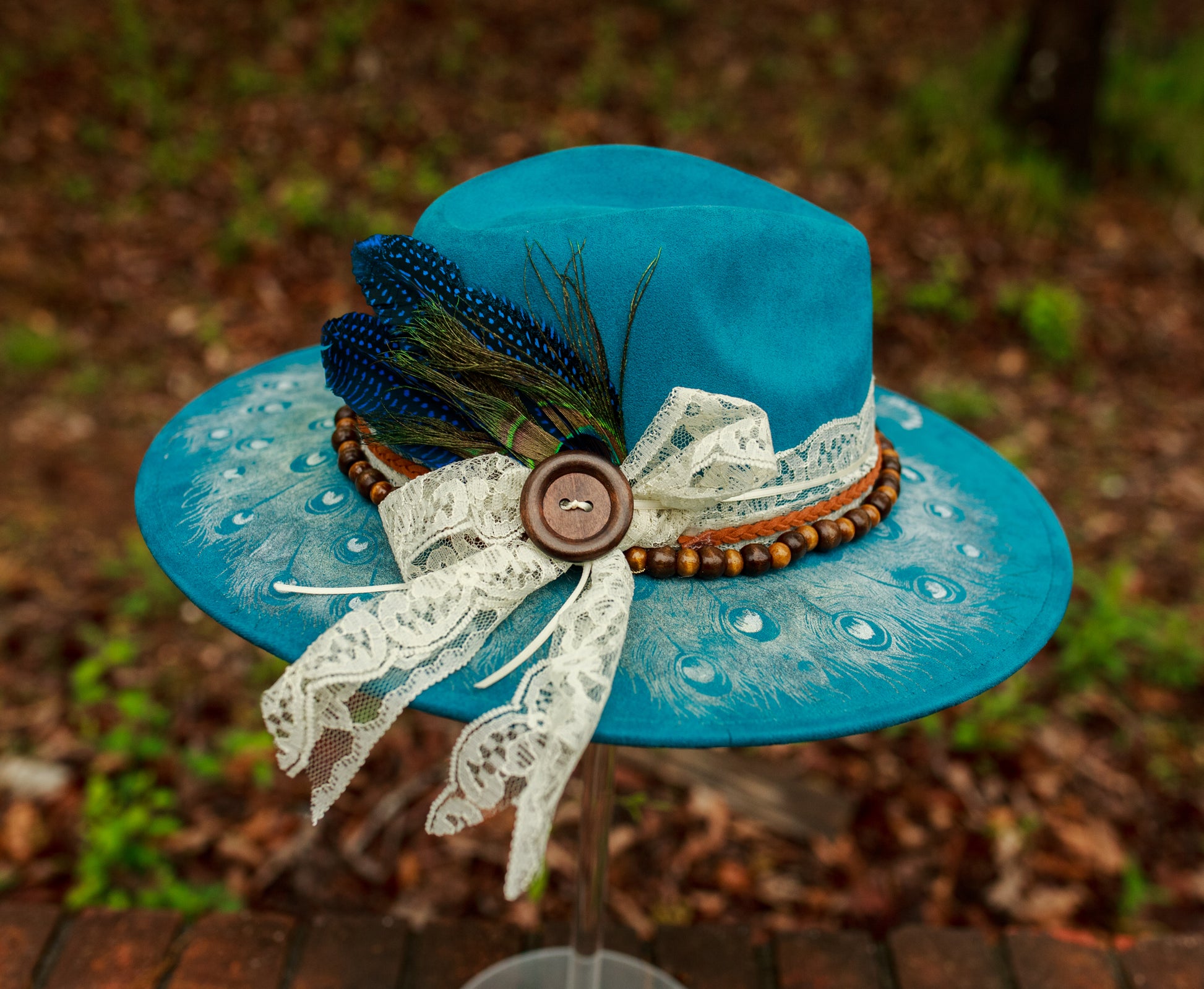 The Penelope Peahen vegan suede wide brim hat, adjustable inside band measuring approximately 56-58cm (about a 7- 71/4) in Ocean Blue. One of a kind, burned and painted with a hand made beaded hat band.