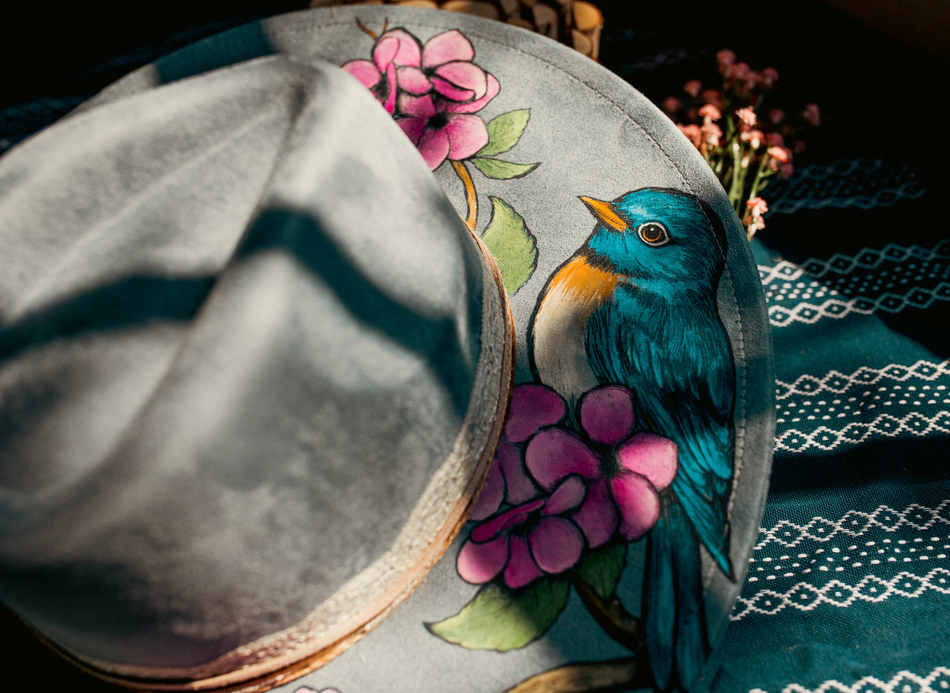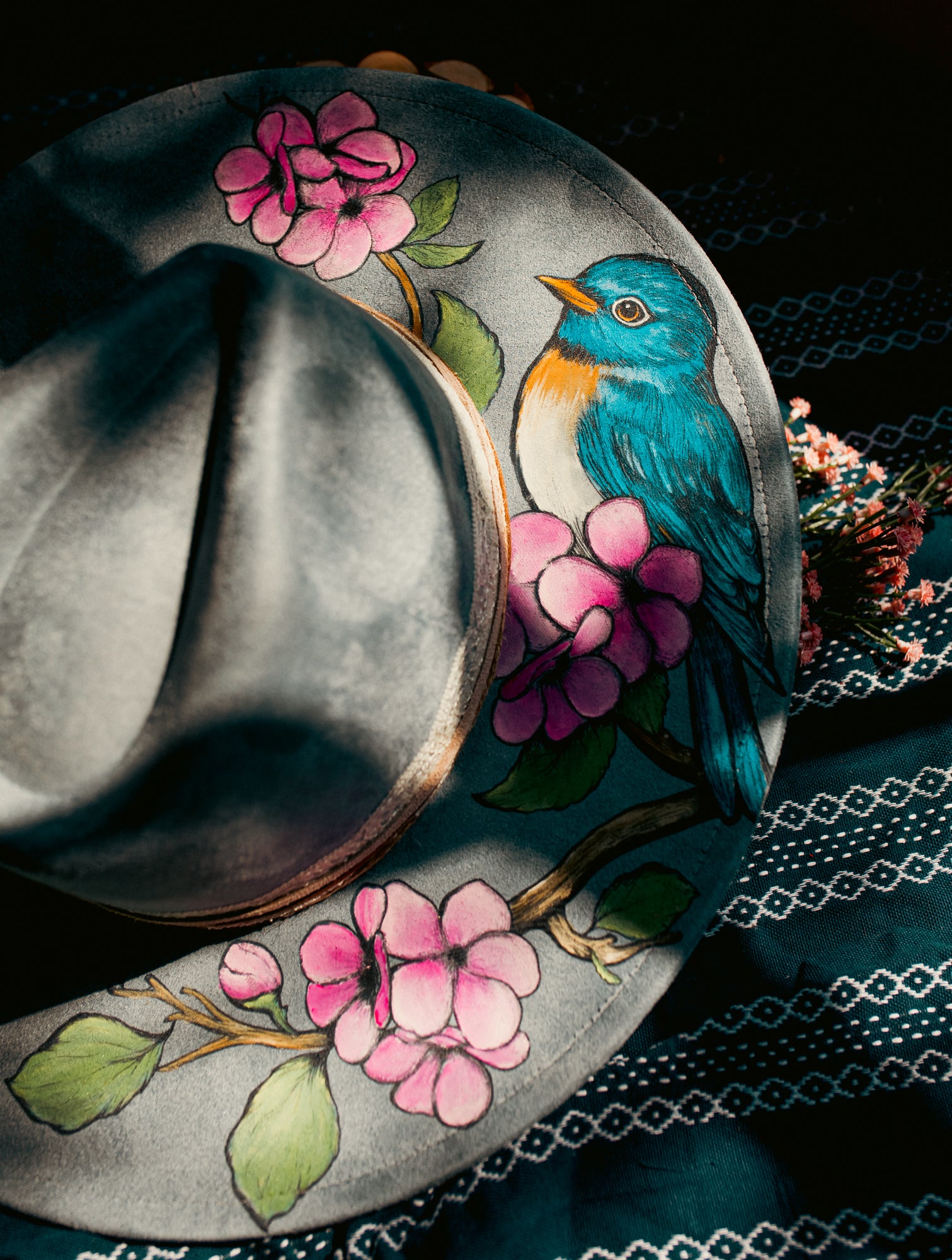 "Pretty Little Bluebird" vegan suede wide brim hat, adjustable inside band measuring approximately 56-58cm (about a 7- 71/4).