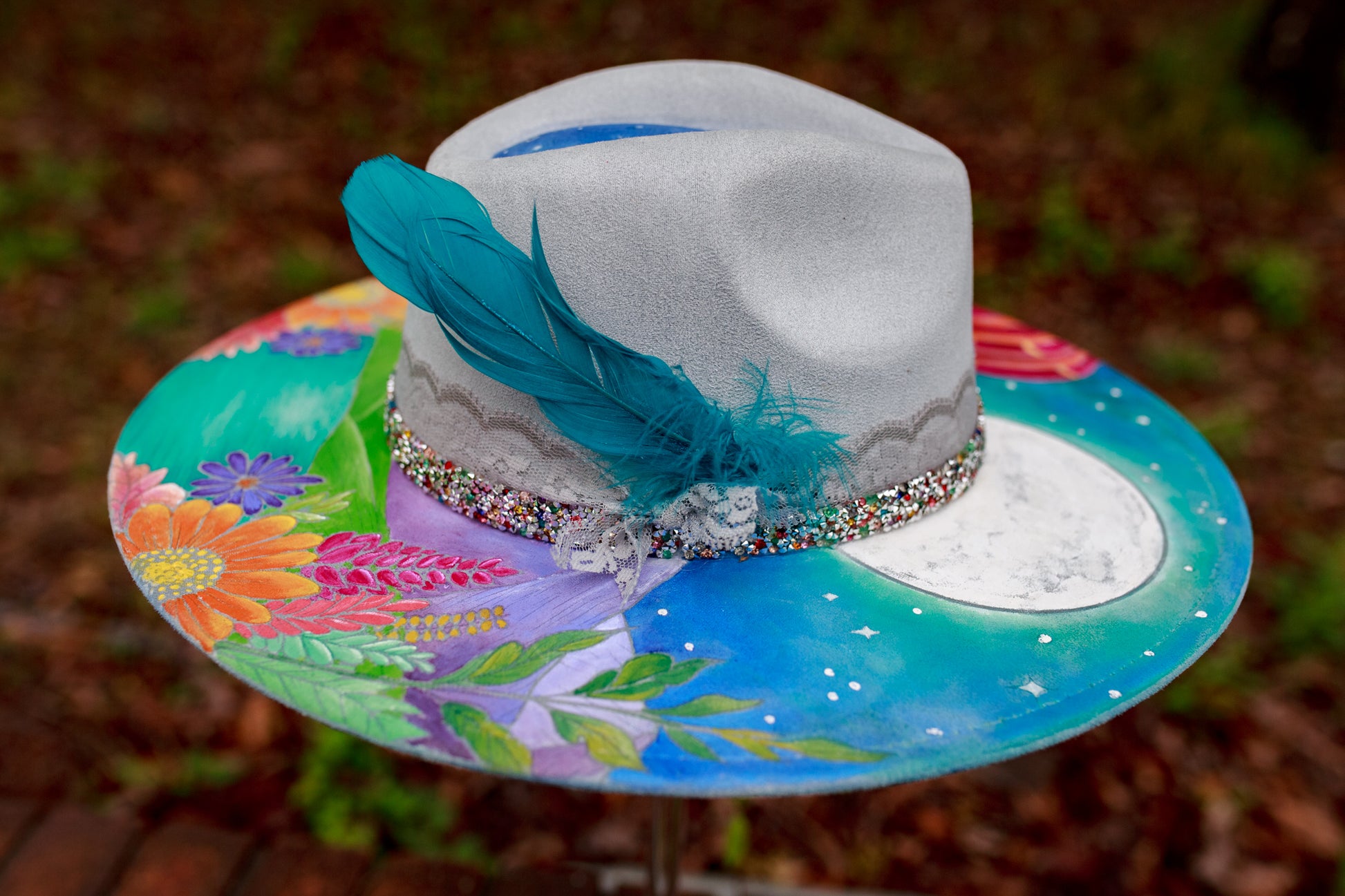 The Wandervegan suede wide brim hat, one of a kind hand painted, adjustable inside band measuring approximately 56-58cm (about a 7- 71/4).