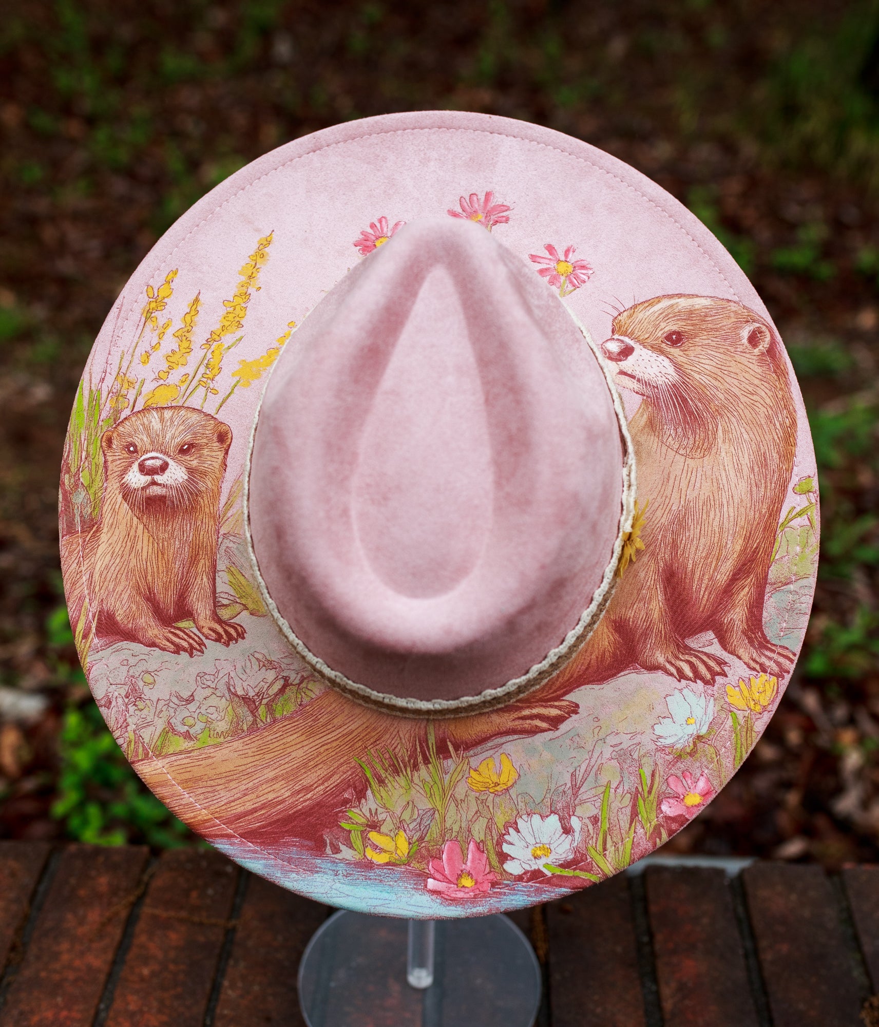 The Otters vegan suede wide brim hat, adjustable inside band measuring approximately 56-58cm (about a 7- 71/4) in dusty pink. One of a kind, burned and hand painted.