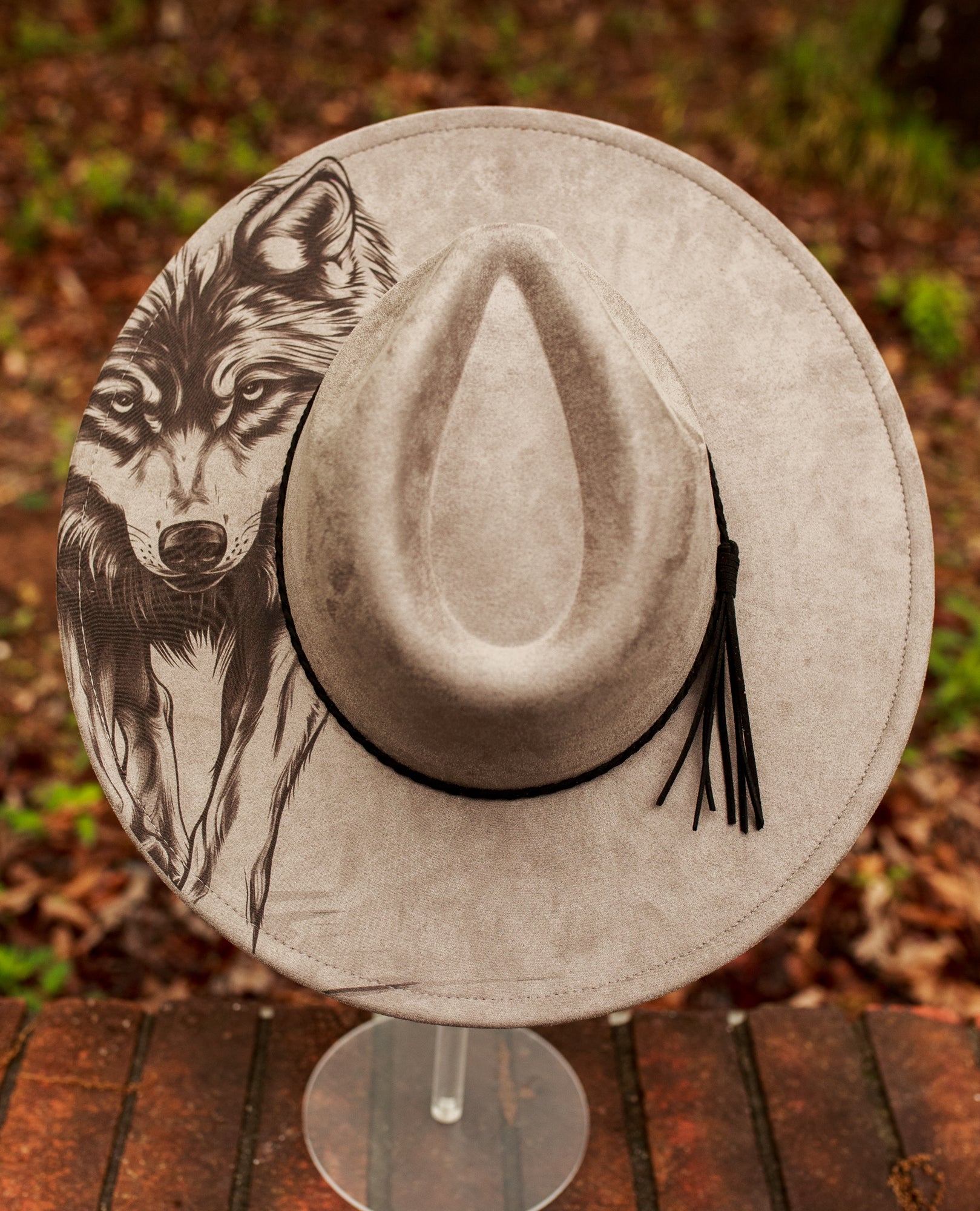 Wolf vegan suede wide brim hat, adjustable inside band measuring approximately 56-58cm (about a 7- 71/4) in gray.